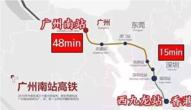 广深港高铁全长145公里,行车时间约69分钟,有7个车站:广州南站-庆盛站-虎门站-光明城站-深圳北站-福田站-西九龙(香港)。