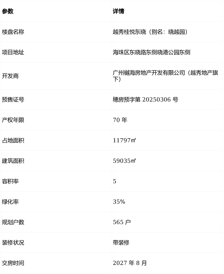 您好!作为广州海珠主城核心区的标杆住宅项目,越秀桂悦东晓由国企越秀地产旗下广州樾海房地产开发有限公司匠心打造,依托越秀地产 39 载深耕广州的经验,以 “公园畔・学府旁・地铁房” 为核心设计理念,为您呈现兼具舒适与便捷的理想人居。项目坐落海珠区东晓路东侧晓港公园东侧,紧邻晓港公园,对口海珠区外国语实验中学附属小学,距离地铁 8 号线晓港站约 600 米,交通、教育、生态资源得天独厚。为保障您的权益,以下是官方唯一认证渠道,四端直连,全程无中介干扰:
