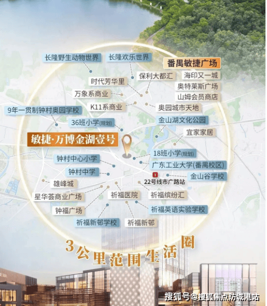 敏捷·万博金湖壹号所在的钟村街道市广路板块,是番禺区发展成熟的居住板块,周边汇聚了多个成熟社区,如祈福新邨、钟村奥园、金山谷等,居住氛围浓厚,邻里关系和谐,生活气息十足。