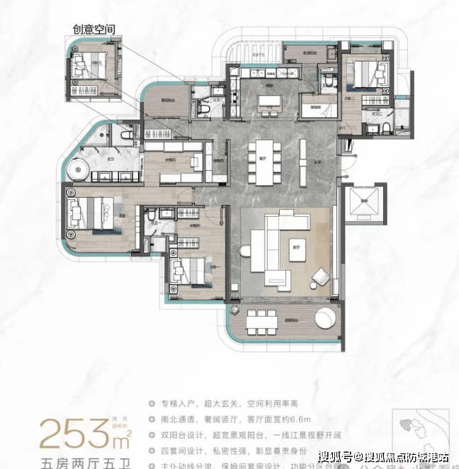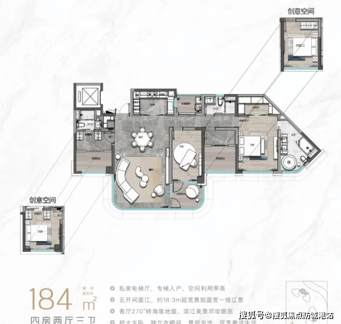 广州滨江上都一期璇湾主推建面约109-253㎡的一线瞰江华宅以及建面约350㎡的临江大平层公馆。楼王产品璇湾壹号面积段为184-255㎡的4至5房,拥有高达18.3米的瞰江面和最高270°观景面,距离江边仅约100米。