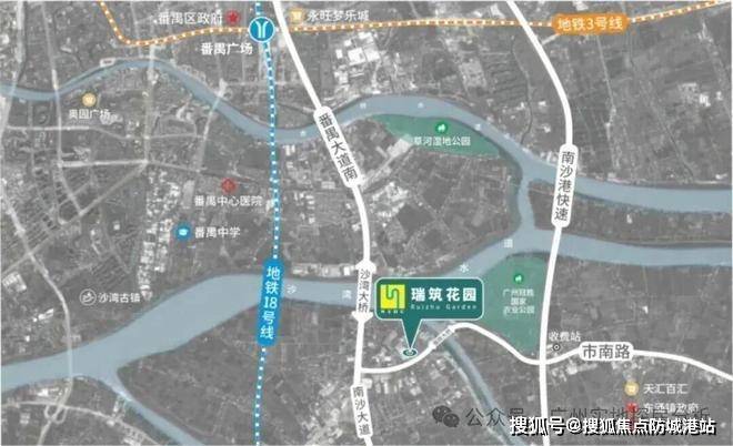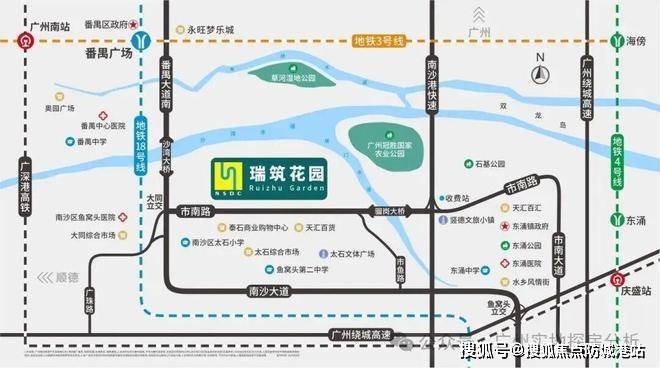项目就藏在市南路与冠胜路交汇处,往北一桥就是番禺区政府,往南几分钟就是南沙自贸区核心,真正卡在广州最有潜力的价值凹陷区。这里不是传统意义上的南沙腹地,也不是高高在上的明珠湾,而是南沙与番禺无缝衔接的桥头堡,位置安静却又刚好踩在两条巨头的肩膀上。