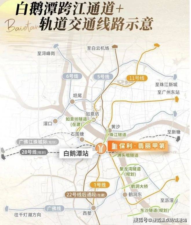 交通优势无与伦比,与地铁 1 号线芳村站仅约 200 米,芳村站即将更名为白鹅潭站,作为主城区唯一的四轨交汇枢纽,汇聚 1 号线、11 号线、22 号线、28 号线四条高能级地铁线,贯穿主城、串联中心区、连接两大交通枢纽以及佛山与东莞。此外,政府规划多条过江隧道,构建立体化交通网络,使白鹅潭成为未来旅游与消费核心,无论是日常出行还是商务出行都极为便捷。