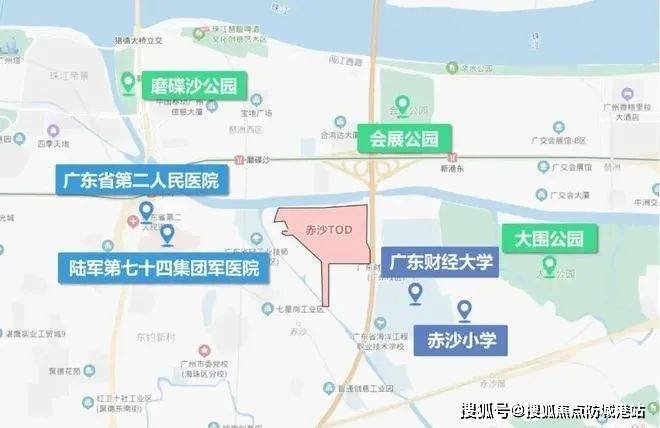 「越秀琶洲南TOD」项目位广东省广州市海珠区金运路1号,海珠赤沙TOD地块东侧紧挨华南快速干线,北侧隔着黄埔涌,对岸就是高楼林立的电商总部琶洲西区。