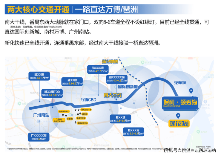 自驾出行:项目距离南大干线750米,这条双向8车道的快速路可以便捷地接驳新化快速,实现半小时内到达大学城、万博、琶洲以及珠江新城等核心区域,极大地方便了居民的日常出行。