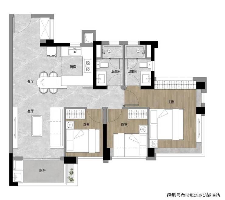 78㎡三房两厅两卫:四开间朝南,超过11米的南向采光面,享受绝佳的自然光线。