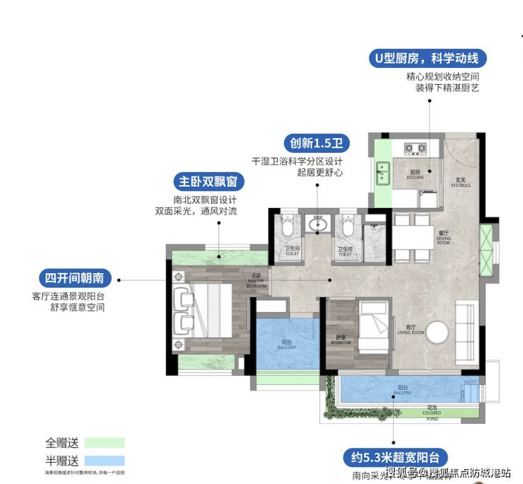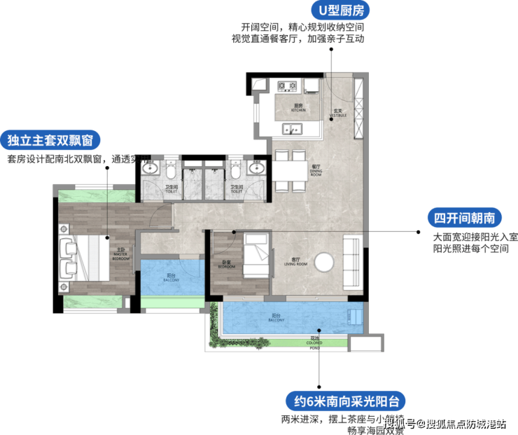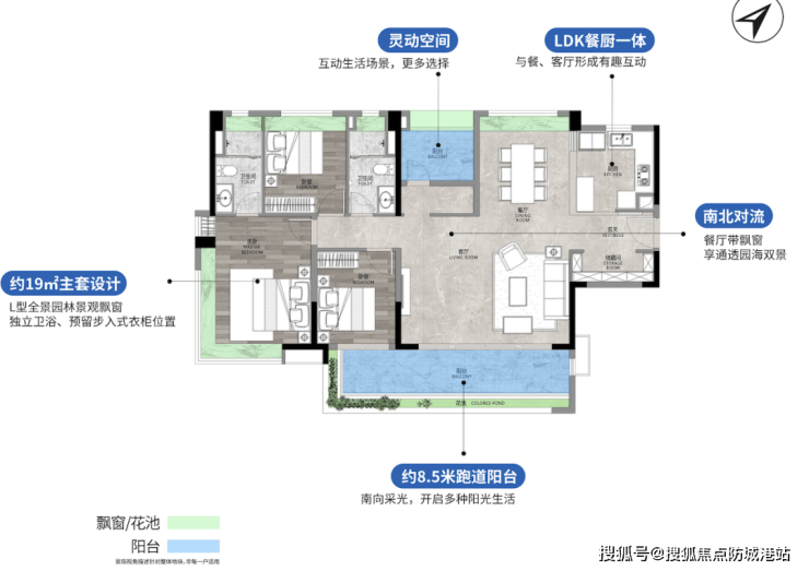 82㎡三房两卫:横厅设计,南北对流,拥有270度超大角度采光。