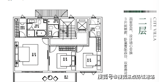 二层:3开间卧室全南向,主卧大套间设计,配衣帽间与浴缸卫生间