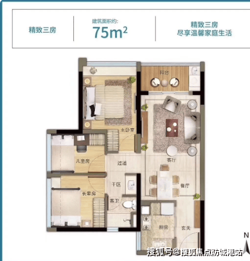 77㎡:3房2厅1卫,北向