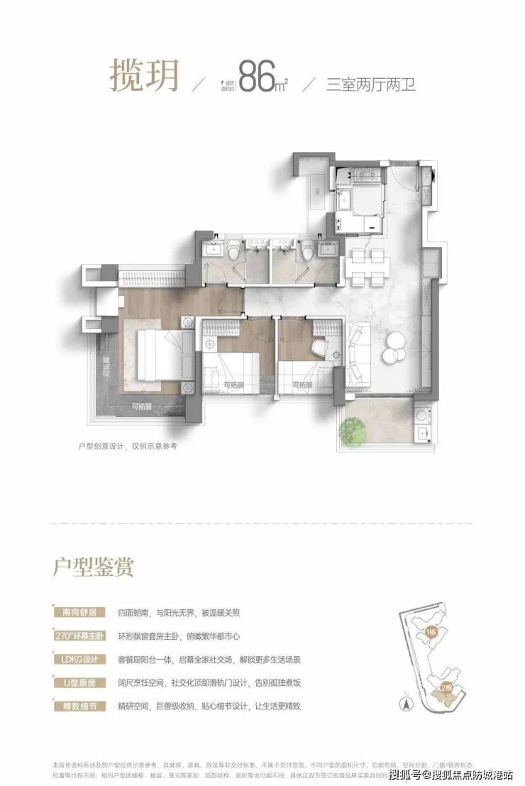 1栋:47层3梯5户,包含建面约86、95、115平方米三种全南向户型。