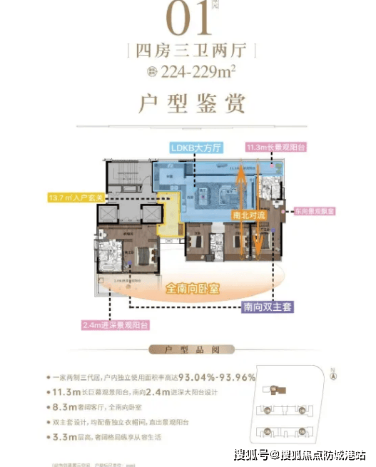 224-229㎡四房户型,适合多人口家庭或追求高端居住体验的改善型买家,户型阔绰大气,空间布局合理,南北双阳台设计,阳台进深最大可达2.4米,既能满足日常晾晒需求,也能作为观景、休闲空间,摆放茶几、绿植等,打造专属休闲角落;飘窗尺寸提升至800mm,足以摆放茶几、梳妆台等,进一步拓展空间利用率;主卧空间阔绰,配备独立卫生间、衣帽间和观景飘窗,尊享高端居住体验;其余卧室均朝南,采光充足,空间宽敞,可满足家人居住需求,同时配备独立书房,为业主提供安静的办公、阅读空间。