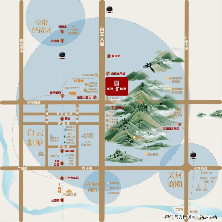 华远云和墅坐落于白云大道北侧,紧邻白云山,享受着城市核心生态资源与繁华商圈的双重优势。从这里出发,20分钟车程即可到达天河珠江新城,30分钟可达白云国际机场,交通便捷性无可比拟。周边还有安华汇、岭南新世界综合体、白云万达广场等大型商业中心,满足居民的高端消费需求。