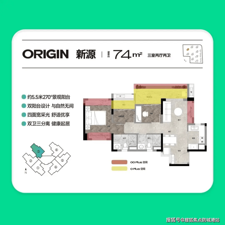 与74㎡户型布局相似,同样拥有5.5米大阳台和四开间采光,空间感更强,动线更流畅,适合对居住舒适度有更高要求的年轻家庭。