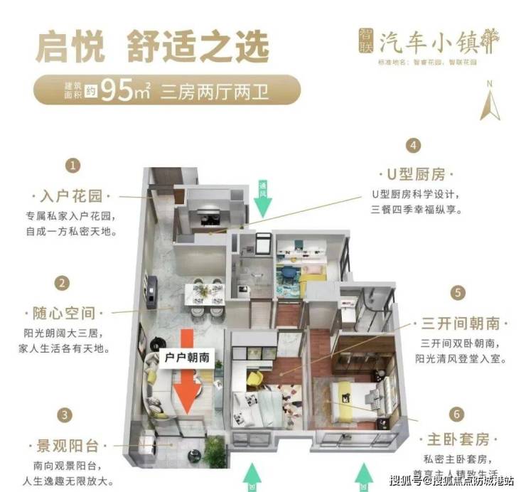 建面95平南向三房两卫,经典竖厅设计,动静分区,带私家入户花园,进门U型厨房,三开间朝南,两个卧室南向,卫生间都是明卫,主卧套房设计,总价205万起!