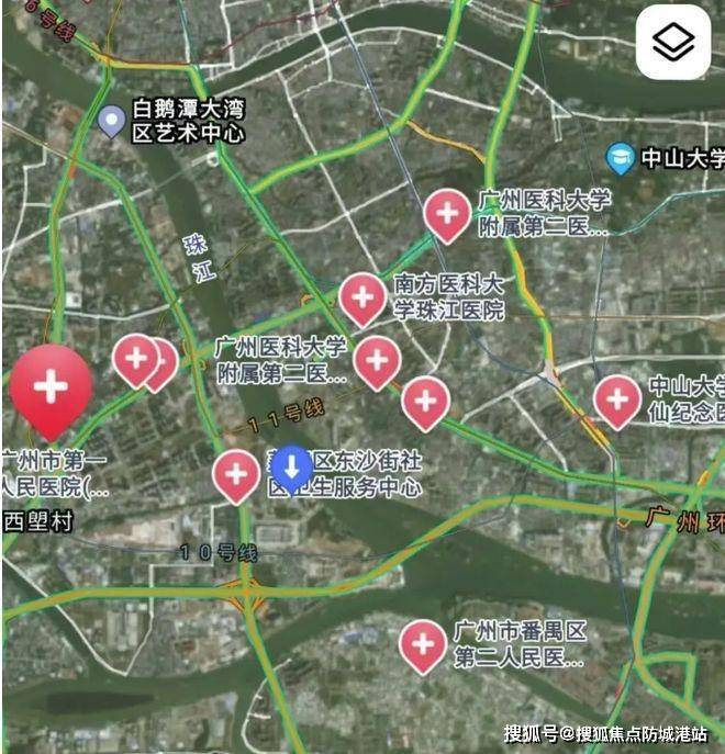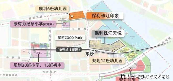项目交通条件极为便利。距离在建的地铁 10 号线东沙站约 700 米,预计 2025 年底开通,届时 1 站可达对岸海珠西,4 站至中大,6 站抵滨江东,更可零换乘直达珠江新城,快速融入城市核心区域。1.3 公里处已开通的地铁 11 号线环线,进一步拓展出行范围。1 公里内分布着健康港总站、沙洛市场等公交站,提供多样化公共交通选择。同时,规划中的水上巴士及港湾码头(计划 3 年内完工)将增添独特出行方式。自驾方面,邻近白鹅潭大道,外通东沙石岗隧道,快速接驳环城高速、东新高速,畅行全城。