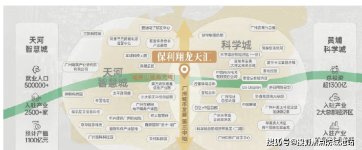 保利翔龙天汇地处广州第三发展中轴线“科技创新轴”,位于天河智慧城与黄埔科学城双城交汇之地,是湾区创新政策的重要承载点。天河智慧城作为广州“最强大脑”,以4倍珠江新城的投资力度打造,已吸引2500家企业进驻,包括网易总部、酷狗等科创龙头;黄埔科学城则是广深科技创新走廊的“创新极”,战略性新兴产业产值占全市50%以上,科技创新能力全国经开区第一。