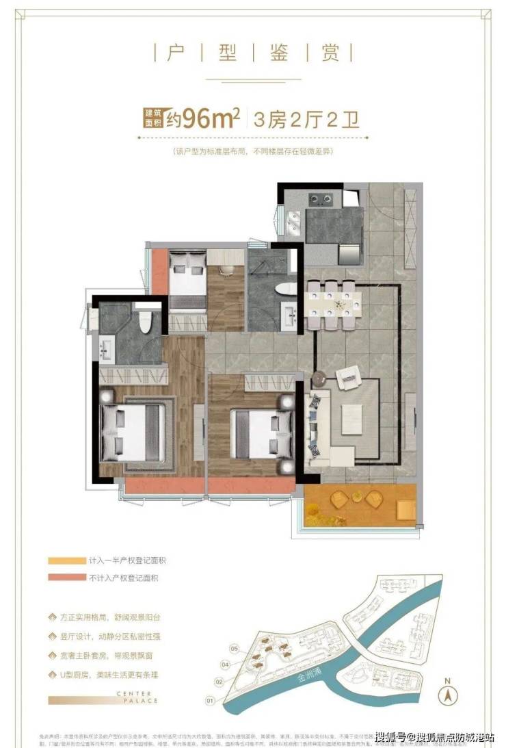 整个项目总占地约8.3万㎡,总建筑面积约35万㎡,内部分为A、B、C、D共4个区域,每一区之间有金洲涌分隔。由于是旧改项目,所以C、D区用作回迁安置,共有8栋,以两梯六户跟两梯四户为主。A、B区8栋为商品房。
