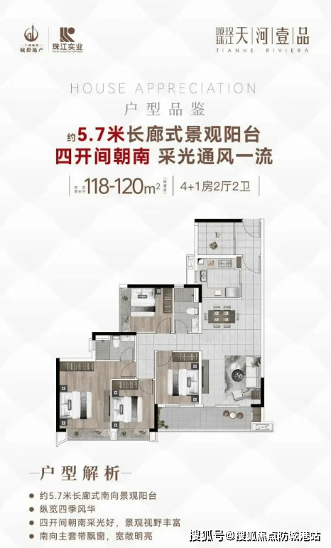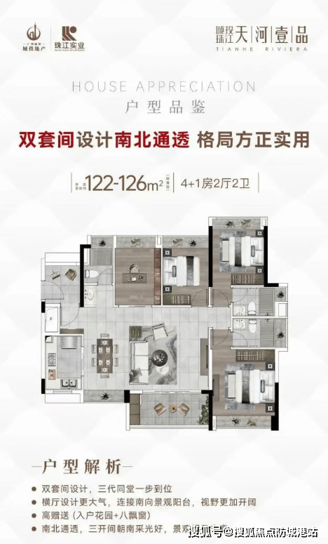 城投珠江·天河壹品推出的户型设计兼顾了实用性和舒适性。例如,96平方米的3+1房户型灵活多变,适合预算有限但追求品质生活的家庭;而120平方米的4+1房户型则为家庭成员较多的家庭提供了充足的空间,南北通透的设计保证了良好的通风和采光;最大的126平方米户型更是配备了更多的卫生间,提升了居住的私密性和便利性。