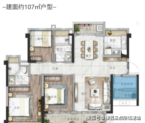 107–113㎡四房:四开间朝南,主卧套房,U型厨房,动静分区;