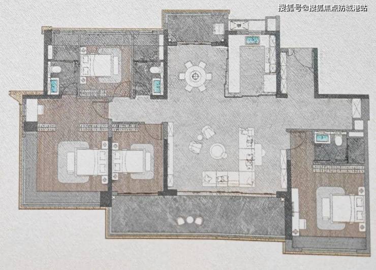 143㎡四房布局与128㎡大致相似,不同的是带南北双阳台。