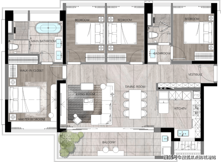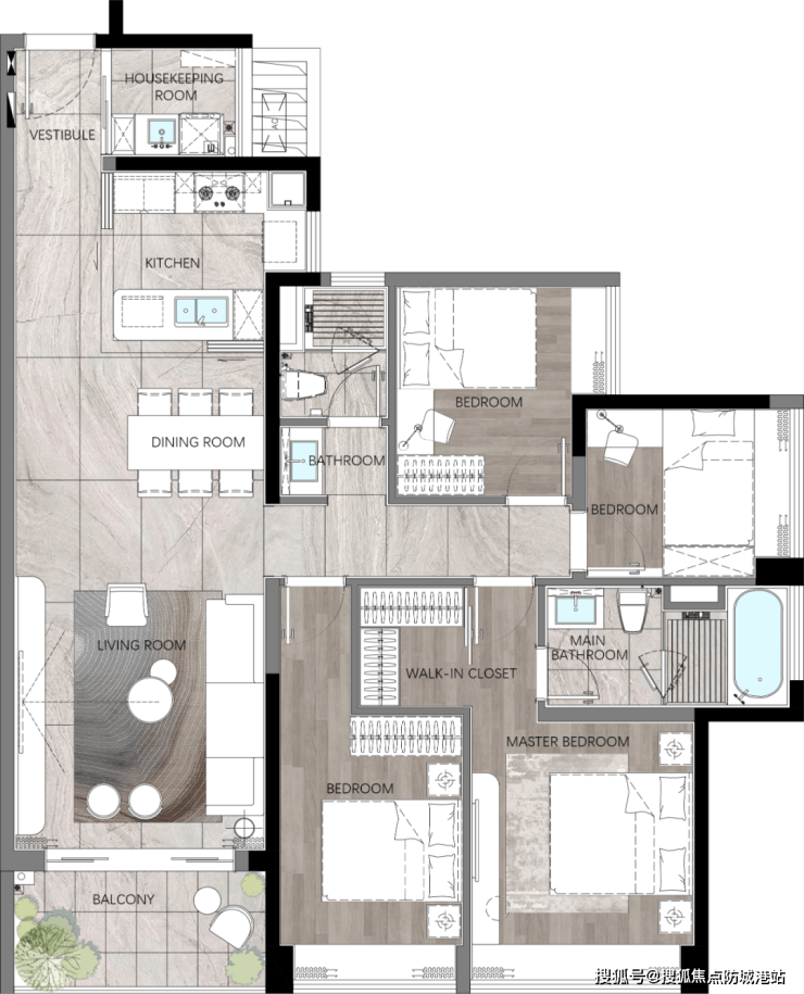 140㎡横厅户型:约7.7米跑道式阳台,LDKG一体化设计,主卧套房配备独立衣帽间+双台盆卫浴;
