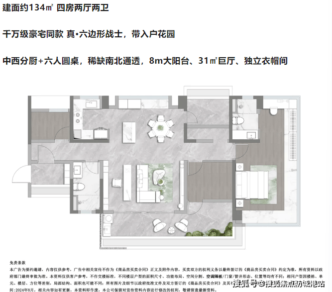 134㎡四房两厅两卫则是高端改善的首选,空间尺度更为阔绰。独立入户花园设计,打造专属归家礼遇,既能作为入户过渡空间,也能改造为绿植区、收纳区。8米大阳台搭配31㎡巨厅,空间开阔大气,彰显主人格调,日常家庭活动、宴请宾客都十分有面。主卧配备独立衣帽间与豪华卫浴,打造尊贵私密的居住体验,目前该户型剩余房源有限,手慢无。