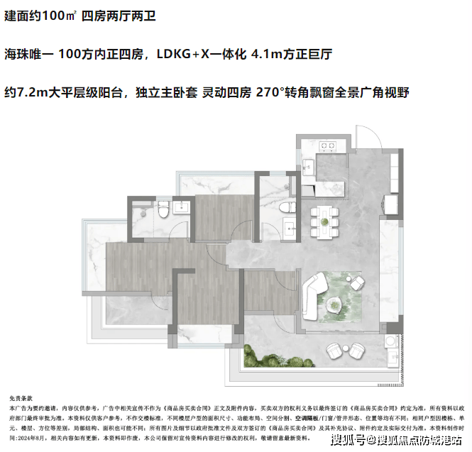 100㎡四房两厅两卫则是区域内少见的小面积正四房户型,完美适配多孩家庭或三代同堂的居住需求。4.1米方正客厅连接7.2米大阳台,阳台空间充足,既能满足日常晾晒需求,也能打造为休闲小花坛、亲子活动区,一物多用。主卧同样配备270°转角飘窗,拓展了空间视野,日常观景、阅读都十分惬意,细节设计尽显人性化。