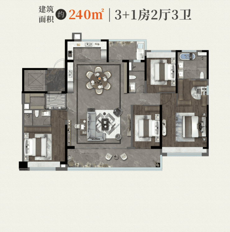 240平方米户型:专梯专户设计,拥有超大空间,适合对生活品质有极高要求的家庭。