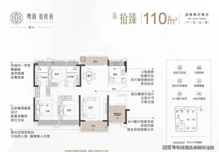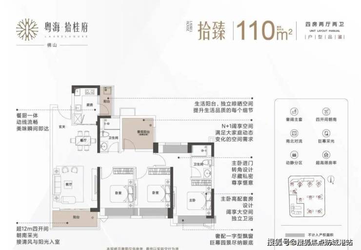 110㎡的四房两厅两卫户型有奢阔主卧、四开间朝南、南北对流巨幕采光、动静分区、超高得房率等多种特点;