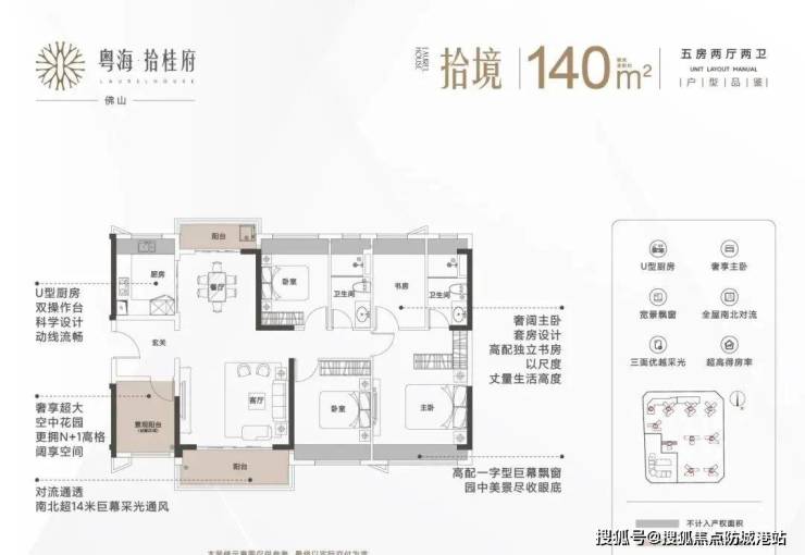 140㎡的五房两厅两卫户型具备U型厨房、奢享主卧、宽景飘窗、全屋南北对流、三面优越采光、超高得房率等特点。