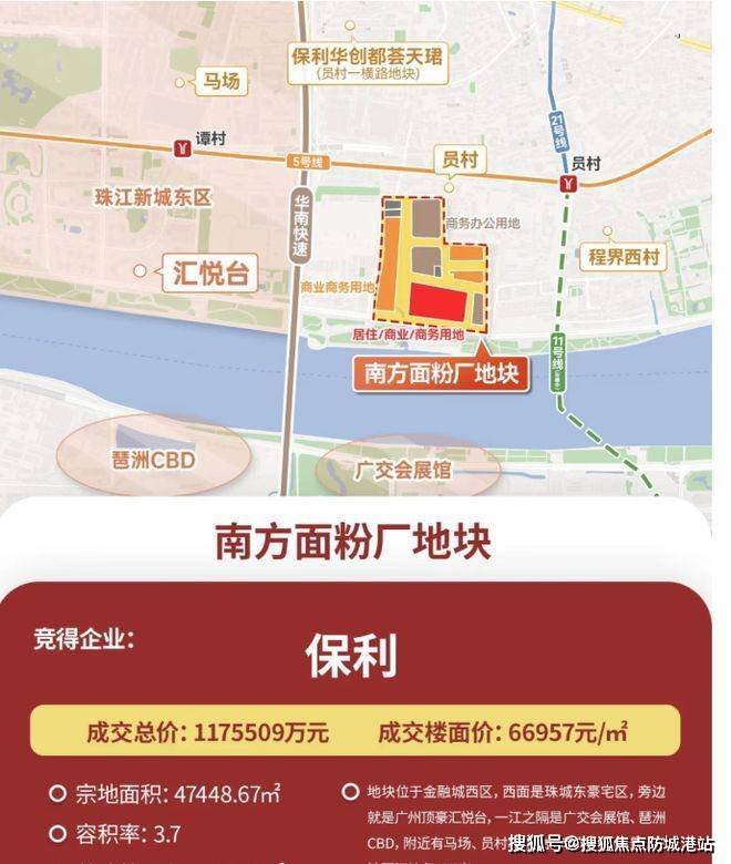 保利斩获天河临江大道北侧 AT080722 地块(南方面粉厂地块),历经激烈竞拍,以高楼面价成为天河地王,仅次于琶洲地王。项目地处金融城西区桥头堡,毗邻珠江新城,与汇悦台相近,尽享优质配套。规划 6 栋住宅,500 + 套房源,定位高端,为全新产品系。交通便捷,距地铁 5 号线与 11 号线交汇的员村站仅 300 米。教育资源丰富,配建幼儿园,对口优质学校,周边学校林立。生活配套完善,3KM 内国际商业汇集,医疗资源完备,生态公园环绕。项目设计独特,打造 11 米挑高空中浮岛、满级会所等创新空间。户型面积约 203 - 630 平,超大玻璃幕墙搭配铝板线条装饰,还有超新规加持,设备高端,未来将成为广州豪宅新标杆。