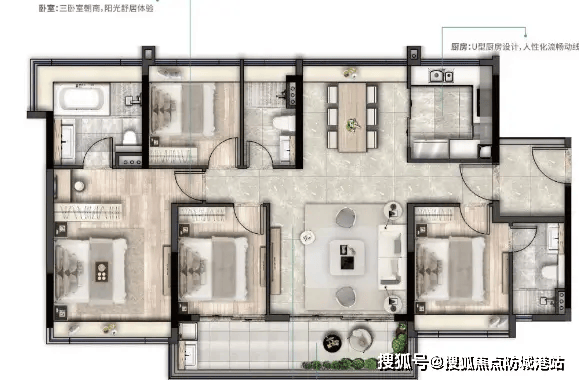 小户型中的“全能选手”。虽面积紧凑,但实现三房格局,适合首次置业或小家庭。U型厨房提升操作效率,主卫干湿分离,卧室均带明窗,采光通风良好。特别值得一提的是,该户型赠送入户花园,既增加收纳空间,又提升归家仪式感。部分高区单位可望江,性价比突出。