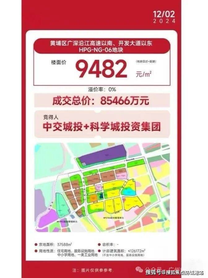 2024 年2024 年 12月2日,黄埔区广深沿江高速以南、开发大道以东HPG-NG-06地块,由中交城投、广州峻森投资以底价拿下,该地块起拍价8.5亿,总建面12.6万平。剔除3.09万平回迁+5149平配建,折合楼面价9482元/平。