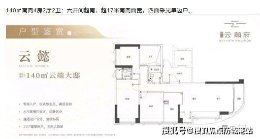 140㎡四房:六开间朝南,单边户设计,四面采光,私密性强,主卧套房+双卫配置,功能齐全;