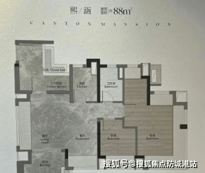 88平米三房:入户花园以阳台报建,算一半面积,客厅有一面墙报建了飘窗,形成了L型采光面,四开间朝南,居住舒适度非常高。