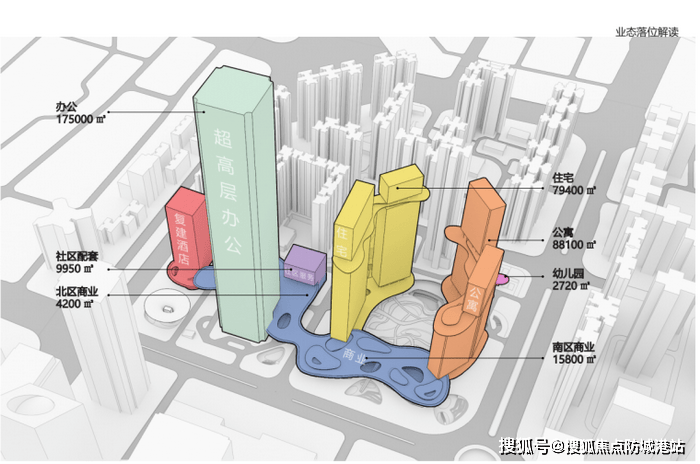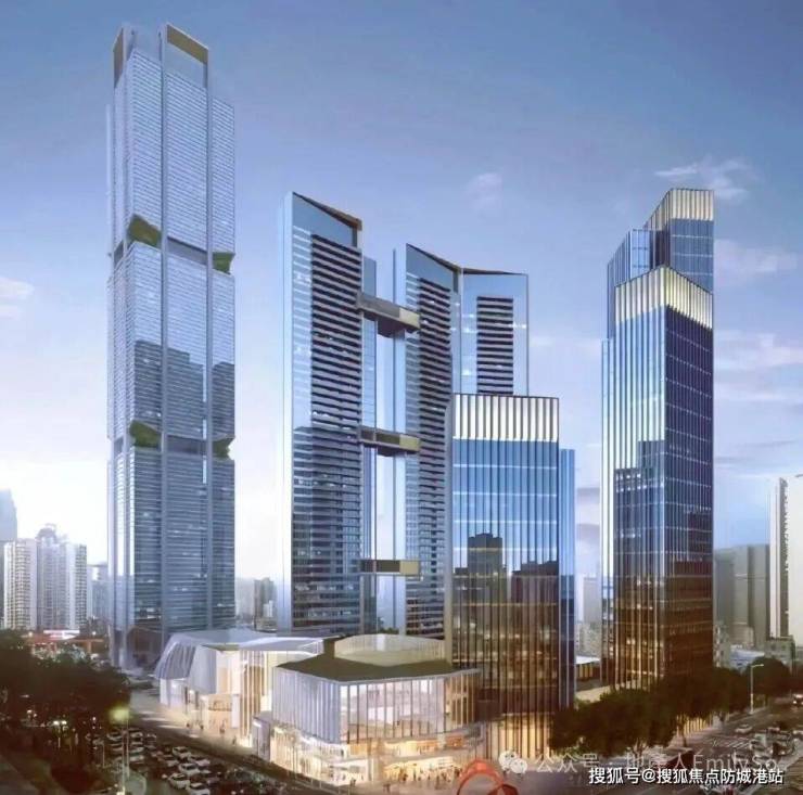 规划构成: 1栋350米超甲级地标写字楼 + 2栋超甲级写字楼 + 3栋47层住宅塔楼 + 1所国际双语幼儿园