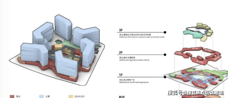 - B1:大型生鲜超市 | L1:中央广场+开放式街区 | L2:巨幕影院+美食天地 | L3:恒温泳池+24小时健身房+创意餐饮;