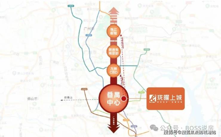 番禺生活新中心:项目于中轴金脉之上,上联万博/琶洲/珠江新城,下联广州未来副中心南沙,承上启下,定鼎未来番禺生活新中芯。