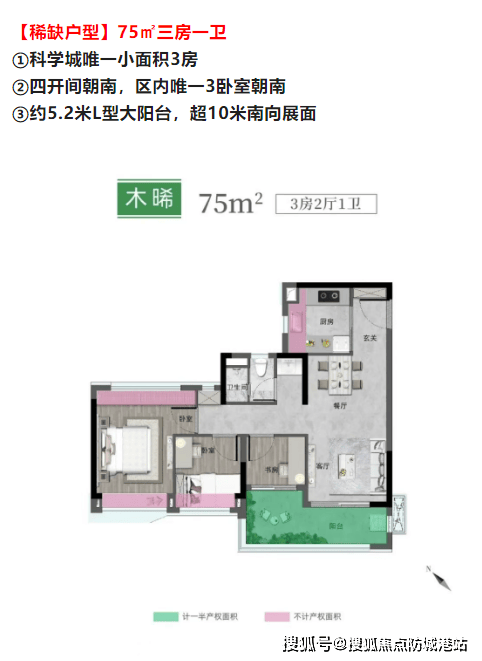 75㎡三房一卫:科学城唯一小面积三房,四开间朝南,带约5.2米L型大阳台。