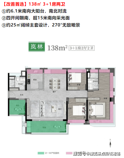 138㎡ 3+1房两卫:约6.1米南向大阳台,南北对流,超15米南向采光面,配备约25㎡阔绰主套设计。