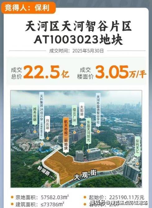 2025年5月30日,保利发展以总价约22.5亿的价格成功竞得航天奇观二期地块,楼面价达3.05万元/平方米。作为今年保利在广州首次拿地的项目,保利辰园湖境不仅具备优越的自然环境,还拥有丰富的教育资源和便捷的生活配套设施,成为广州市天河区备受期待的新住宅项目。