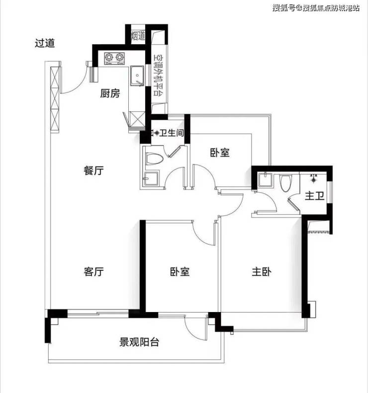 先来看约96㎡三房户型,做到了三开间朝南,阳台也有高达6米的开间,那么采光和通风就不成问题。