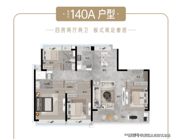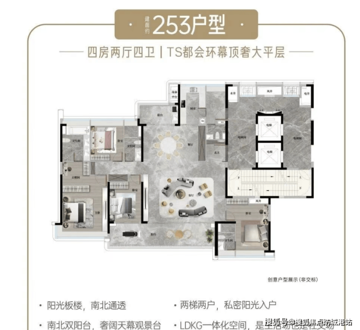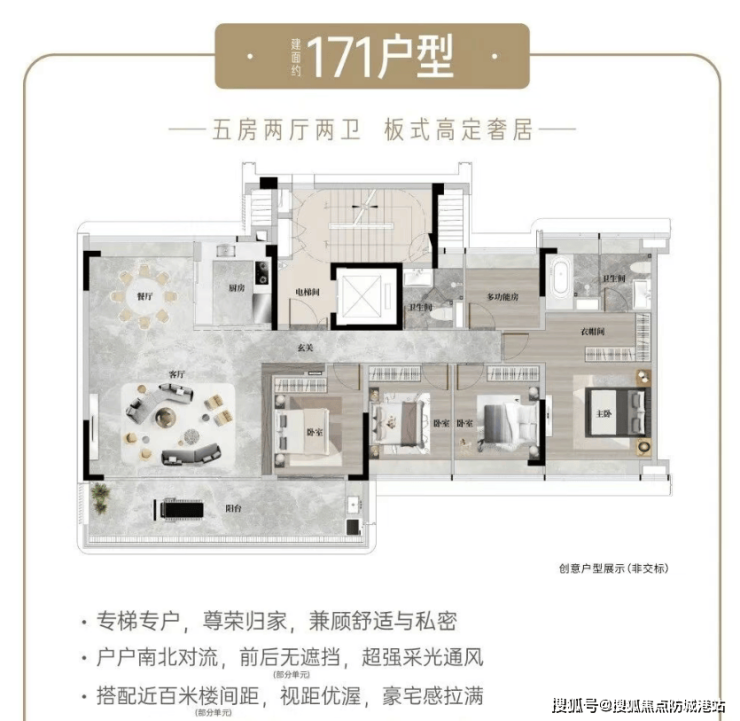 空间布局: 专梯专户,私属电梯门厅。四开间朝南,南北对流。双阳台设计,近 9 米宽巨幕阳台。