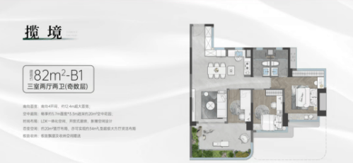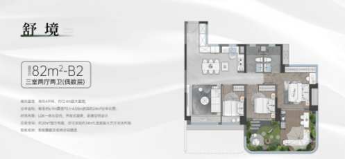 82㎡户型:3房2卫,竖厅格局,客厅可以与次卧打通形成超级大方厅,四开间朝南,南向面宽达12.4米,空中花园面积最大可达24平方米。
