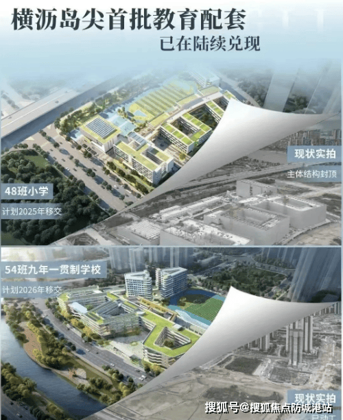 横沥岛上规划有丰富的教育资源,包括小学3所、九年制学校3所、十二年制学校1所以及一所国际学校。其中,一所54班九年制学校(预计2026年投入使用)和一所48班小学(预计2025年投入使用),将为岛上居民提供优质的教育资源。