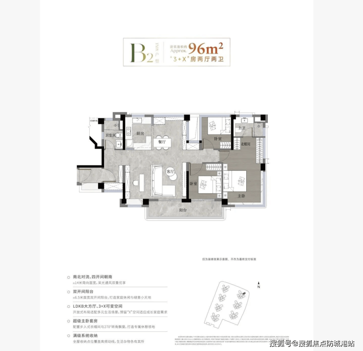 步入中建·未来方洲的实体样板间,首先感受到的是新规户型带来的空间震撼。以96㎡样板间为例,其套内实际使用面积堪比传统110㎡户型,这得益于LDKB(客厅、餐厅、厨房、阳台)一体化的创新设计,使得公共活动区域极为宽敞通透。开间达到5.8米的景观阳台,不仅延展了视觉边界,更将城市的繁华天际线与社区的静谧园林尽收眼底,实现了室内外交互的无界融合。