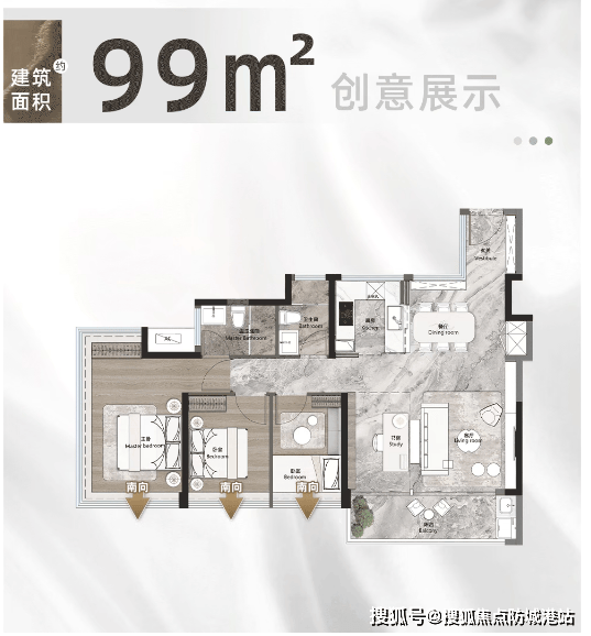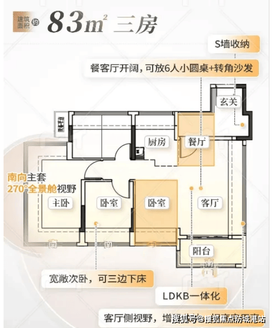 布局:该户型为单边位设计,整体布局方正,全南向朝向,采光通风俱佳;入户设置玄关,增加收纳空间,保护室内隐私;客餐厅一体化设计,衔接南向阳台,延伸室内空间,提升空间利用率;三个卧室均朝南,分布合理,互不干扰;两个卫生间均为明卫设计,通风效果好,避免潮湿异味。