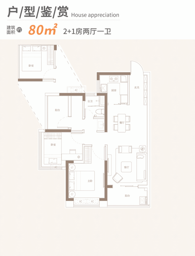 户型设计:建面约80-143㎡三至四房,南北通透,得房率超85%。