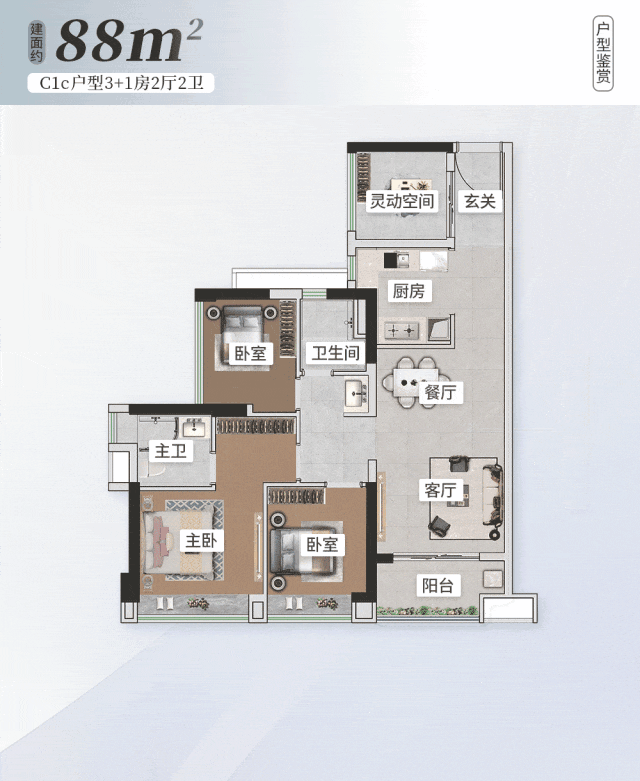 88㎡3+1房户型:升级为四个房间的配置,媲美新规产品,空间利用率极高。多出的一个房间可根据家庭需求改造为书房、儿童房或储物间,完美适配三口之家、二胎家庭等不同阶段的居住需求,性价比突出。