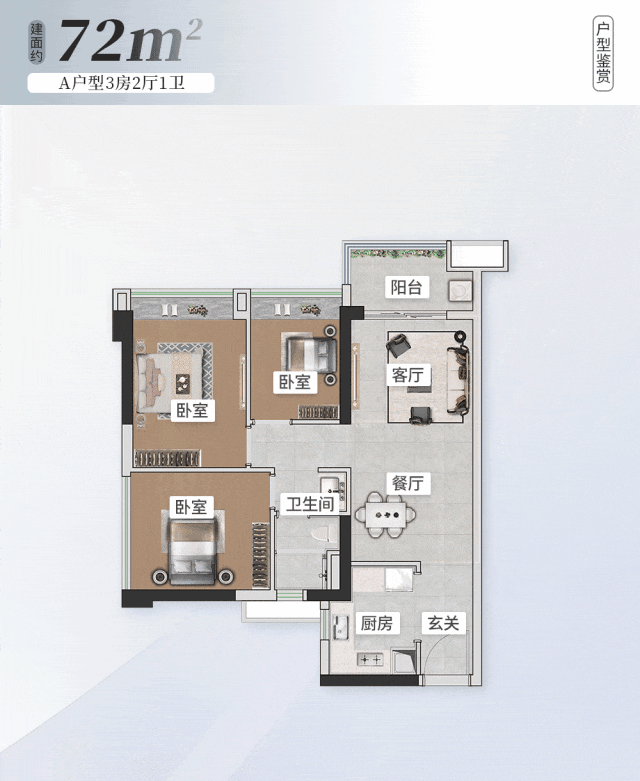 72㎡三房户型:整体方正实用,空间均衡性高,每个房间都能放下双人床,不显得逼仄。厨房、卫生间布局合理,动线流畅,满足刚需家庭的基本居住需求,同时为家庭未来成长预留了一定空间。