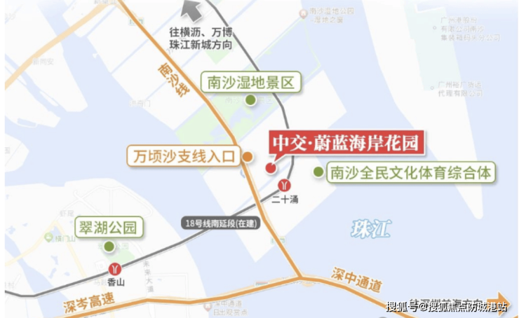 项目紧邻深中通道南沙线收费站及在建18号线南延线二十涌站,同时规划深南中城际铁路,未来实现半小时跨城通达,通勤便捷。